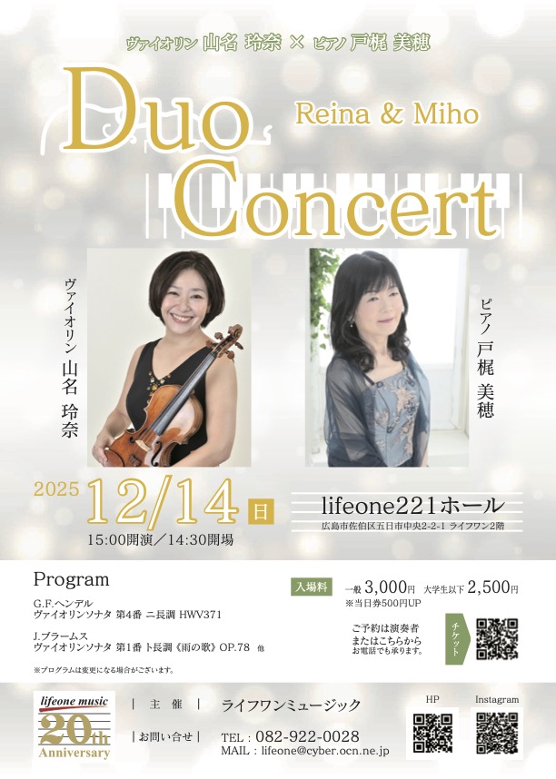 コンサート 2025.10.14 2025/12/14(日) Reina & Miho Duo Concert コンサート名 Reina & Miho Duo Concert 日時 2025/12/14(日) 14:30開場 15:00開演 場所 ライフワン221ホール 入場料金 一般:3,000円 大学生以下:2,500円 参加申し込み PREV 一覧に戻る NEXT