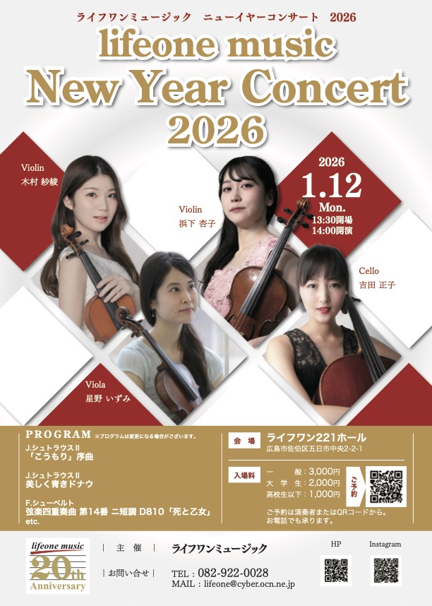 コンサート 2025.11.12 2026/1/12(月・祝) ライフワンミュージック New Year Concert 2026 コンサート名 ライフワンミュージック New Year Concert 2026 日時 2026/1/12(月・祝) 13:30開場 14:00開演 場所 ライフワン221ホール 入場料金 一般:3,000円 大学生:2,000円 高校生以下:1,000円 参加申し込み PREV 一覧に戻る NEXT