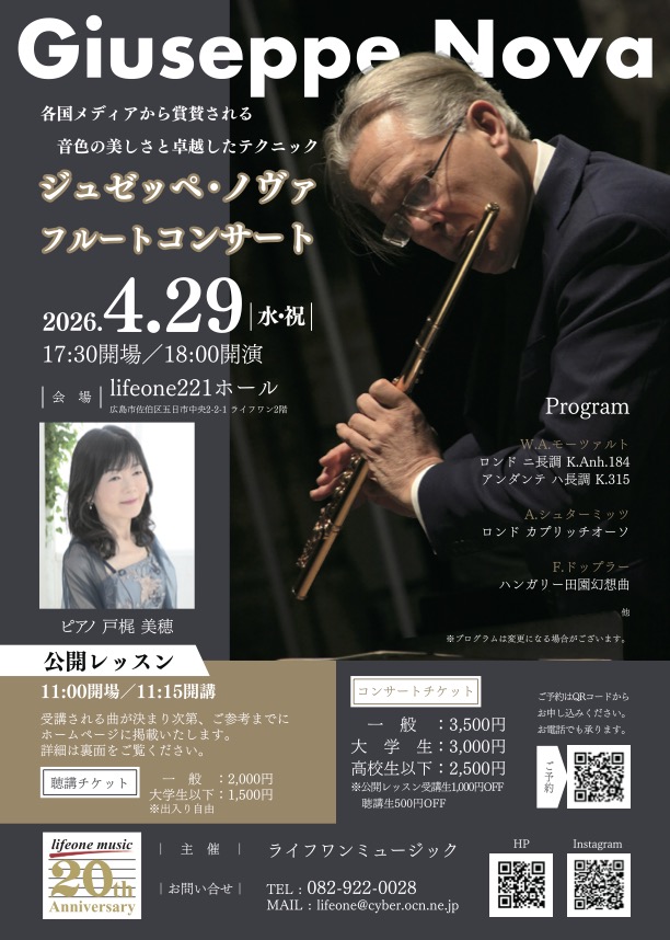コンサート 2026.03.02 2026/4/29(水・祝) ジュゼッペ・ノヴァ フルートコンサート コンサート名 ジュゼッペ・ノヴァ フルートコンサート 日時 2026/4/29(水・祝) 17:30開場/18:00開演 場所 ライフワン221ホール 入場料金 一般:3,500円 大学生:3,000円 高校生以下:2,500円 参加申し込み PREV 一覧に戻る